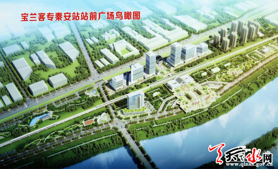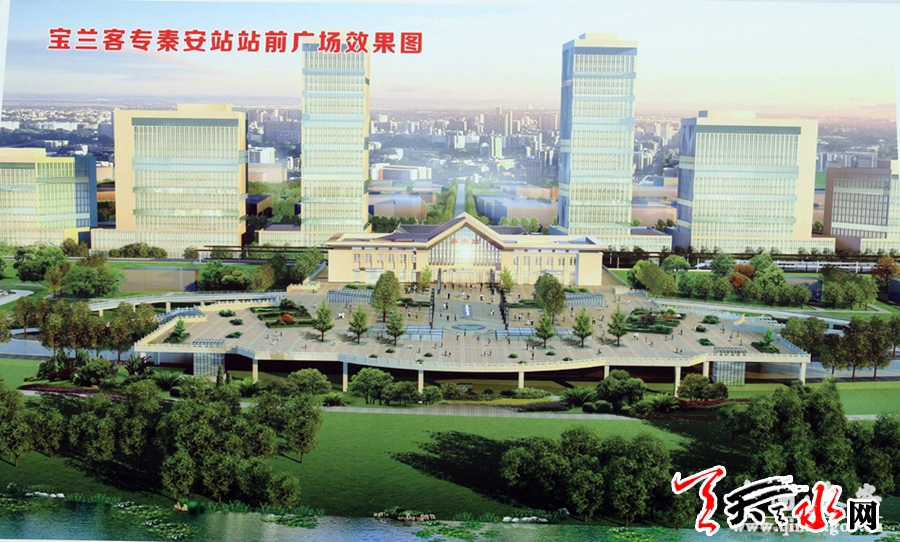 宝兰客专秦安站站前广场设计立足于“羲里娲乡”的文化精髓,采用规则式与自然式相结合的手法,中轴由名人题刻—时钟花坛—主题雕塑与音乐旱喷广场—舞美射灯舞台构成,两侧八根艺术柱廊象征素有“羲里娲乡”之称的秦安历史文化八景。整个主体貌似大鹏展翅,通过地面浮雕和图腾柱等建筑小品,彰显秦安深厚的文化积淀和悠久的历史传承。