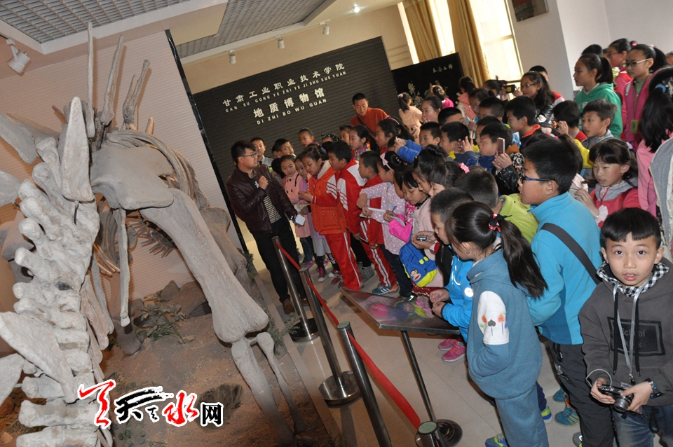 甘肃工业职业技术学院地质博物馆是“天水市科普教育基地”。现有矿物标本、岩石标本、矿石标本、古生物标本、地质构造标本、宝石标本、玉石标本等藏品1万余件,其中不乏珍品。该馆在为本校师生科研教学服务的同时,也向我市广大青少年敞开科普大门,各大中专院校和中小学师生可在周一至周五进馆参观。4月2日,130多名天水日报社校园小记者在家长的陪伴下走进甘肃工业职业技术学院,零距离参观了学院的地质博物馆,小记者们在讲解员的带领下一进博物馆大门,就被一具7米长,2米高的沱江龙化石(复制品)所吸引,他们有的忙着仔细聆听讲解员的讲解,有的不时向讲解员提问,有的认真记录着资料介绍。跟随者讲解员的身影,小记者们认真的零距离的参观了古生物标本、矿物标本、岩石标本等展厅。