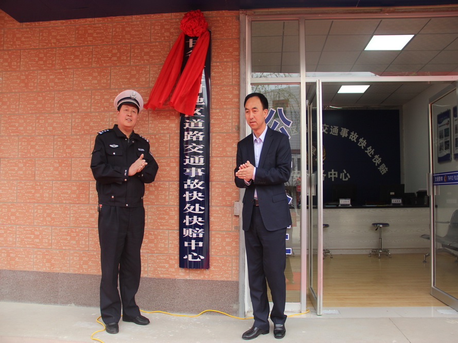 县委常委、政法委书记冯全敬和市交警支队副支队长许维正为磐安镇农村道路交通事故快处快赔服务中心揭牌。