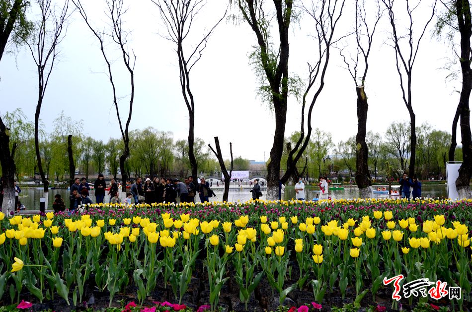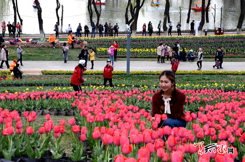 四月的天水,目不暇接的烂漫花海渲染着春色的喧哗 。天水市麦积区马跑泉公园成簇连片的郁金香在春风里花 浪翻涌,竞相怒放,一派如火如荼、万紫千红的妩媚境界 。