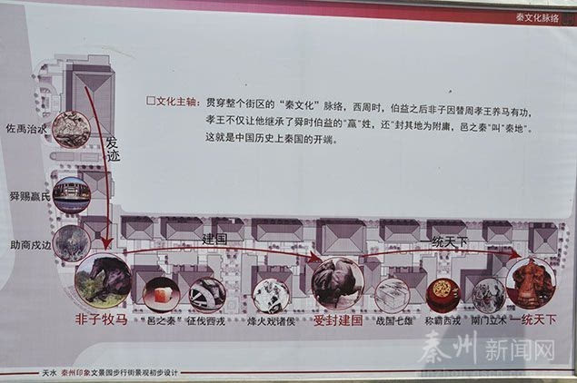 文化主轴 以历史发展的时间顺序为主线,在商业步行街主要入口雕塑“非子牧马、舜赐赢氏、受封建国、征伐西戎、烽火戏诸侯、战国七雄、南门立木、一统天下”,再现一个个鲜明的先秦故事,提高了步行街的文化品位。