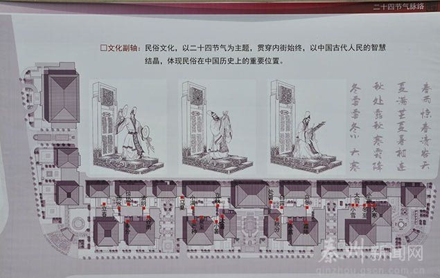文化副轴二 主要体现民俗文化,以二十四节气为主题,贯穿文景园步行街内街始终。主要通过铺装、浮雕、雕塑、绿化等方式打造景观小品,形象体现立春、雨水、惊蛰、春风、清明、立夏、立秋、立冬等二十四节气,让游客对中国独有的农记立法得以直观形象的认识。