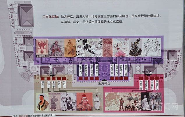 文化副轴一 主要在步行街外景体现天水的文化底蕴。主要以雕塑、浮雕、铺装等方式为载体,展现伯益、轩辕、秦非子、李广、李白等历史人物,伏羲画八卦、女娲补天等地方神话,远古遗址、三国文化、石窟文化等地方文化,从神话、历史、民俗等方面全面体现天水悠久的文化底蕴。