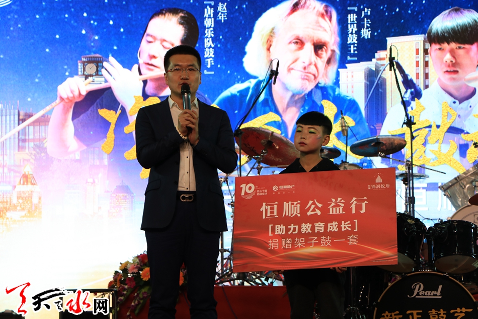 当天,恒顺地产也邀请来世界鼓王卢卡斯、中国鼓王赵牧阳、唐朝乐队鼓手赵年、天水籍连续3届全国双料冠军曹嘉宇等诸多音乐大咖,现场表演鼓乐技艺。卢卡斯激昂的打击乐里,充满着西方乐曲的震撼和舒缓,一次次鼓棒落下,化作震撼的音符,在心中不断回响激荡;赵牧阳,一次次的鼓乐敲击,迸发出中国民族音乐魅力,粗犷高昂的乐曲间,沉淀着对西北大地的眷恋。赵年、曹嘉宇也纷纷亮相,以富具个性特色的打击乐,抒发着自己对音乐的见解,快促的节奏,昂扬的乐调,每一个表演都像竞赛一般激烈震撼。