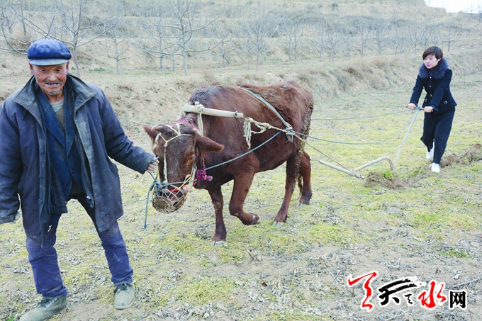 在小刘的带领下,我来到了马家庄。虽然已经是四月天了,但站在村路上,还是会有阵阵寒意侵袭而来,幸好我早有准备,穿得也很厚实。这时,小刘招了招手喊了一声“马书记”,我顺着小刘手指的方向看到了正在和村民一起犁地的马书记。马书记对我的到来,表示了欢迎。就在这时,耕牛发出了“哞”的叫声,我着实被吓了一跳。拉着牛的村民看到我有些害怕,便对我说:“别怕,这牛挺乖的,你可以摸摸看。”我胆怯地将手伸到牛的背上摸了摸,牛真的没有凶我。这时,我心里突然冒出了想体验一下如何犁地的想法。