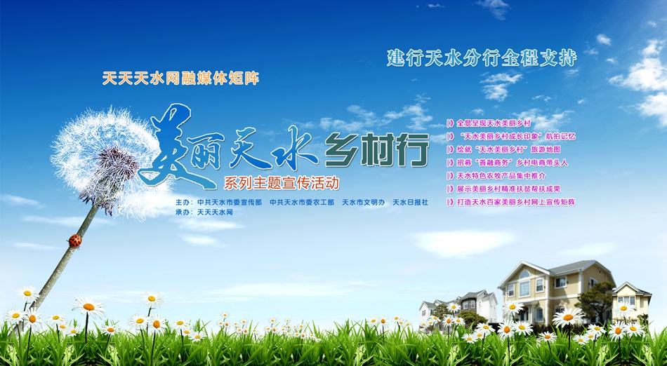 由天水市委宣传部、天水市委农工部、天水市文明办、天水日报社联合开展的“美丽天水乡村行”大型主题采访活动,围绕社会主义新农村建设的总体要求,以美丽天水秀美乡村为焦点,集中展示十二五期间天水新农村建设新成就,本次活动由中国建设银行天水分行全程鼎力支持。