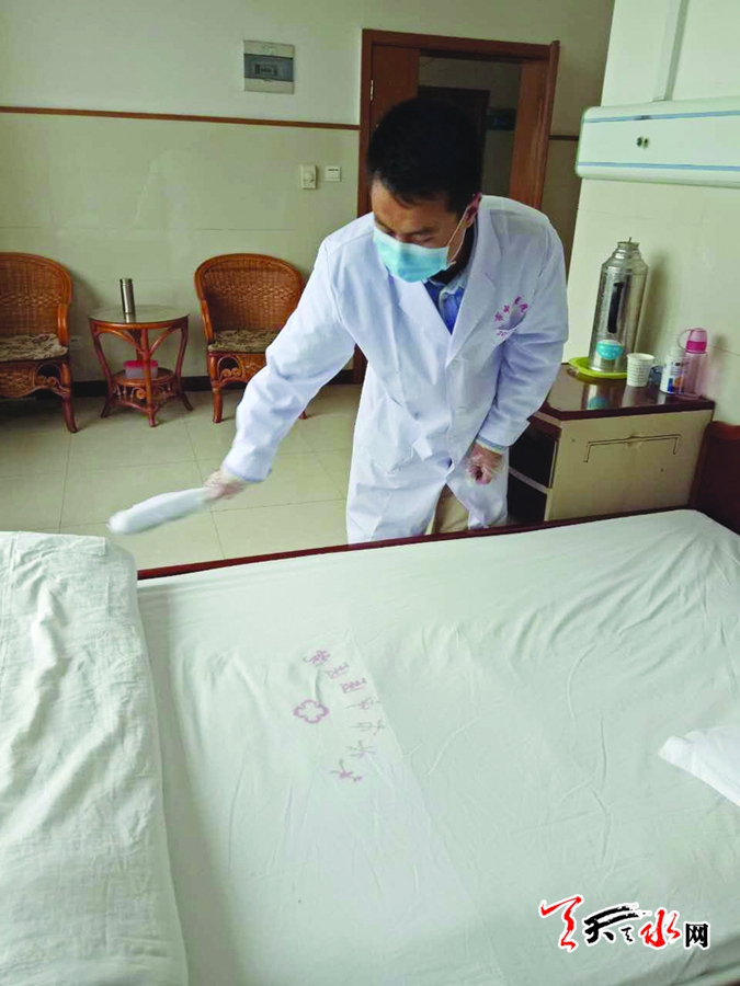 在连庆霞的带领下,我们开始推着一辆装有清洁用品的护理车挨个房间去清扫。清扫完成后,要将所有凌乱的物品整齐归类,之后还要检查每张病床上的被褥是否整洁,如发现有污物的要及时清理更换,同时还要与患者及家属沟通,询问睡眠可好、身体有无异常……