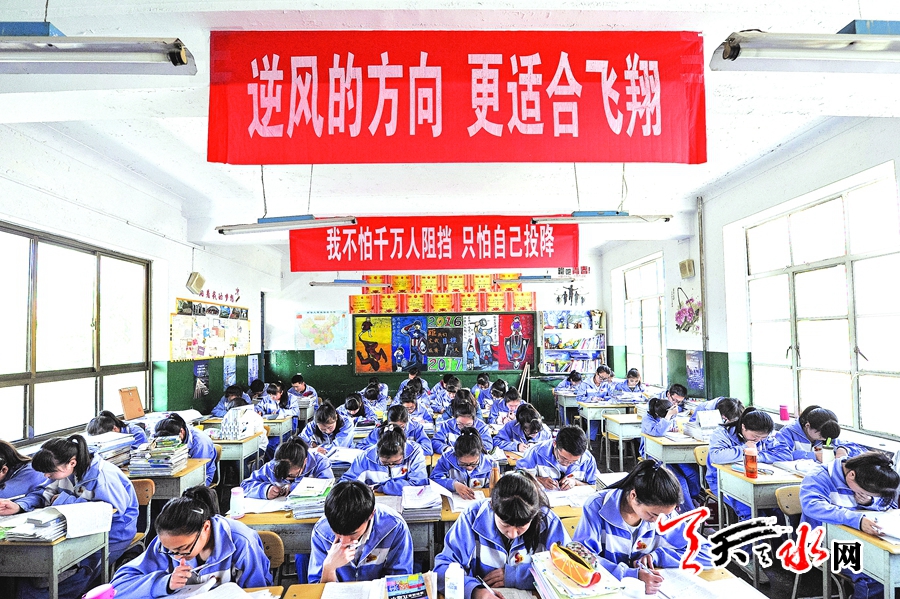 “提神”且励志的标语下,老师在黑板上写满密密麻麻的英语单词、数学公式,学生们埋头做着试题,眼前是一摞摞码放整齐的课本和教辅书。一次次的模拟考试、一堂堂的考题讲解。高三毕业班的老师和学生们铆足了劲备战高考。