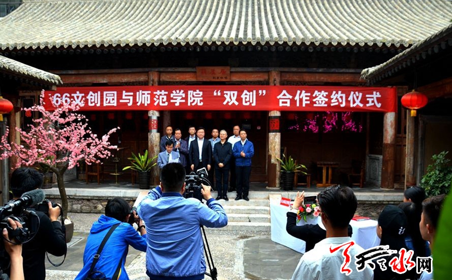 天天天水网讯【记者孙镇】5月17日,天水66号文化创意园与天水师范学院签约,就双方共同推动校企战略合作达成框架协议。市委常委、副市长李晓东,天水师范学院校长蔡文浩出席签约仪式。