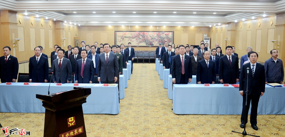 会议结束时,王光庆主持新任命人员宪法宣誓仪式。会场全体人员起立,奏唱《中华人民共和国国歌》。国歌奏唱完毕,新任命的天水市人民政府代理市长王军走到宣誓台前,左手抚按《中华人民共和国宪法》,右手举拳,进行了庄严宣誓。