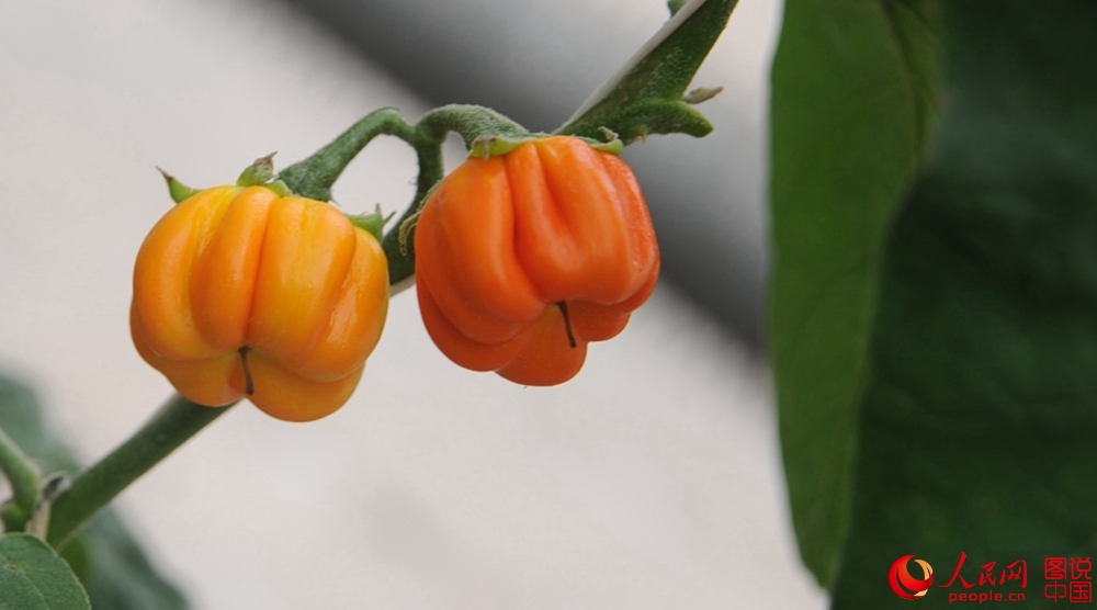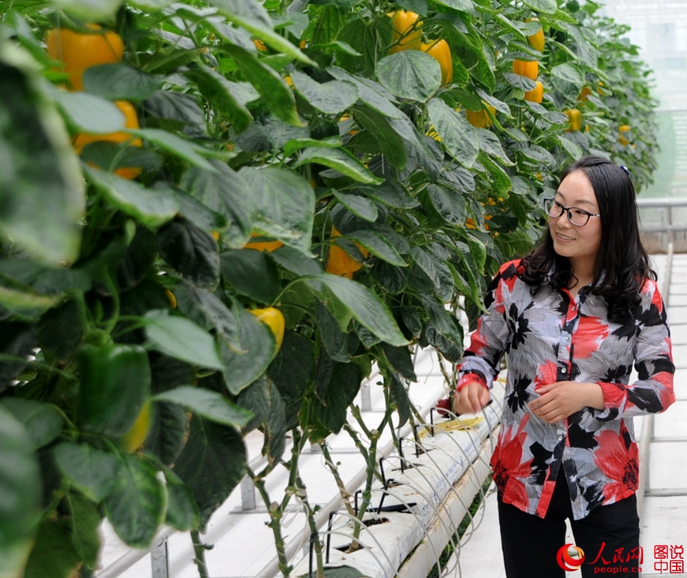 技术人员察看五彩椒生长情况