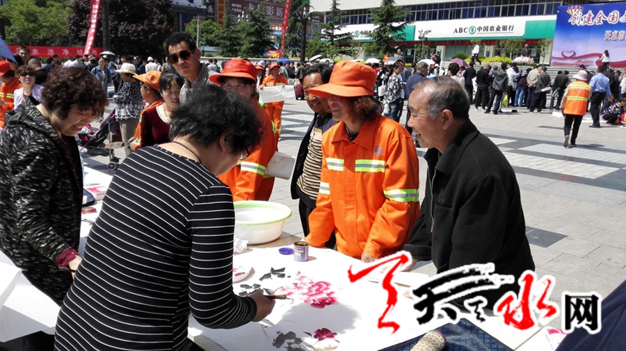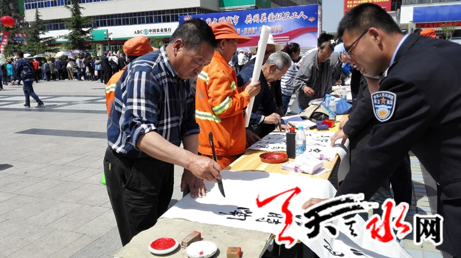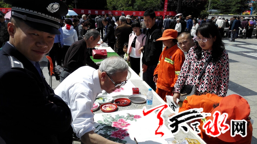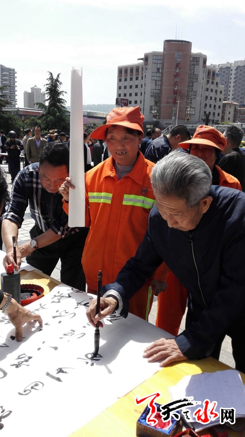今年4月24日,天水市委、市政府在秦州大剧院召开全市创建全国文明城市动员大会,正式启动全国文明城市创建工作。创建全国文明城市,工作量大面宽,任务艰巨繁重。全市各级各部门要严格对照市委、市政府的要求,着力增强全市经济实力,加强理想信念教育,提高市民文明素质,加快基础设施建设,优化城乡发展环境,打造特色创建品牌,结合实际积极创造天水的“自选动作”,努力做到补弱项、建强项、扬优势、创特色。创建全国文明城市,不单纯是为了摘取一顶桂冠,获得一份殊荣,更是改善人民群众生活环境和生活质量。作为城市的一分子,每位市民都有责任和义务践行基本道德规范,自觉遵守城市的各项管理制度和规则,自觉加强自我教育、自我管理、自我监督,自觉履行文明行为规范。通过自己的文明行为,为文明城市建设加砖添瓦。在全市上下积极为创建努力的同时,环卫工人一直冲锋在创建的第一线,他们的每一份努力,每一滴汗水都渗透着创建的艰辛。为了唤起全市人民对环卫工人的关爱,天水市老年书画研究会和秦州区文明办共同举办的“送书画、献爱心”大型公益活动,给默默工作在秦州区环卫一线的环卫工人送上一份问候,献上一片关爱。当天,天水市老年书画研究会的100多位书画家顶着烈日,从早上8点多开始连续挥毫3个多小时,为全区环卫工人送上书法、绘画近千幅,极大的满足了环卫工人对书画的爱好,也极大的鼓舞了他们美化家园、为创建全国文明城市努力奉献的决心。