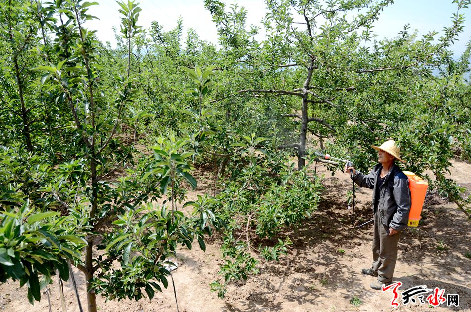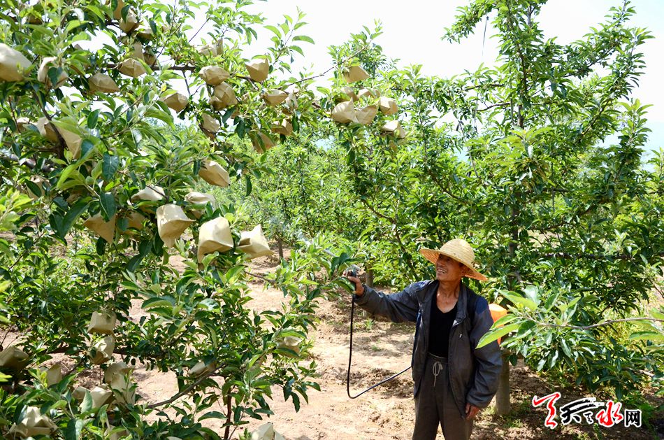 5月25日,秦州区中梁镇满山遍野的苹果树吐露着新绿,枝桠上缀满的苹果在金色的暖阳里泛着一层鹅黄。杨家山村的果农张根学背着喷雾器,正在悉心地给长势喜人的苹果喷洒农药。