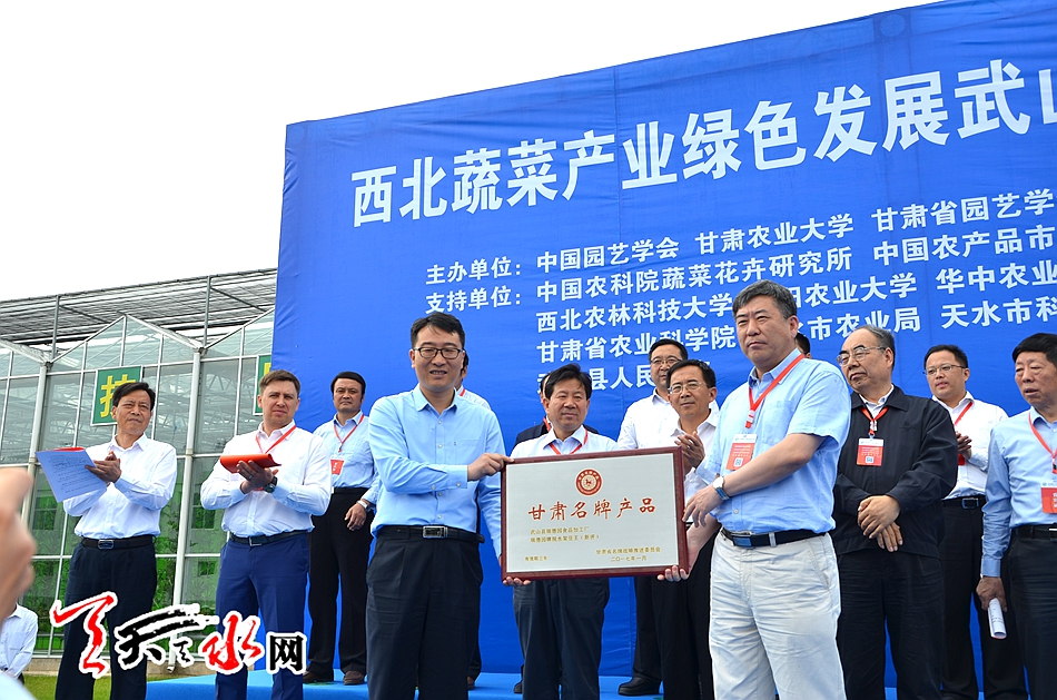 开幕式上,省工商局、省质监局还分别向武山县颁发了“武山蒜苗地理标志证明商标”证书、“省级农业标准示范区:武山北顺日光温室黄瓜标准化示范区”证书和“甘肃名牌产品:瑞德园脱水架豆王”标牌。