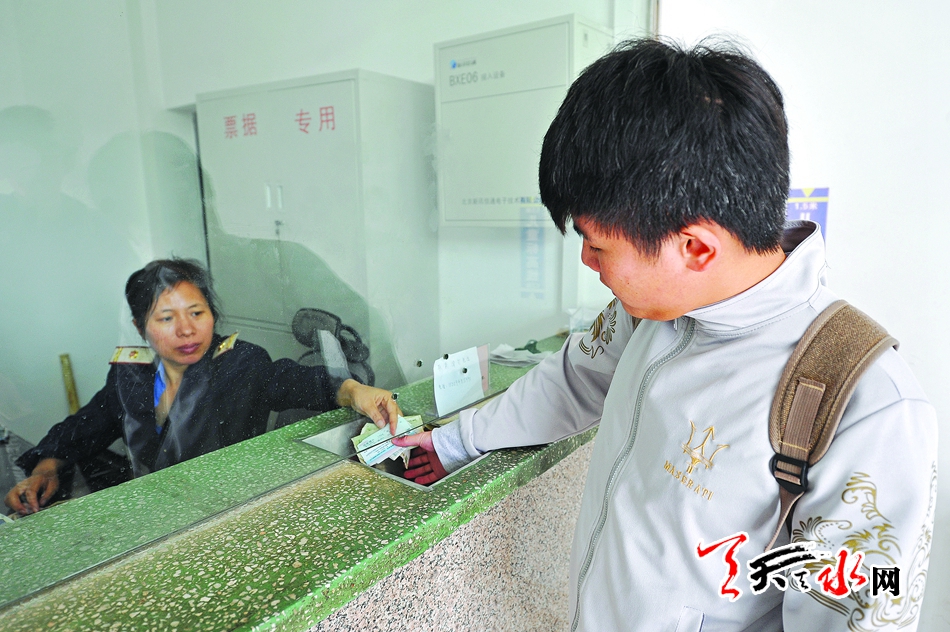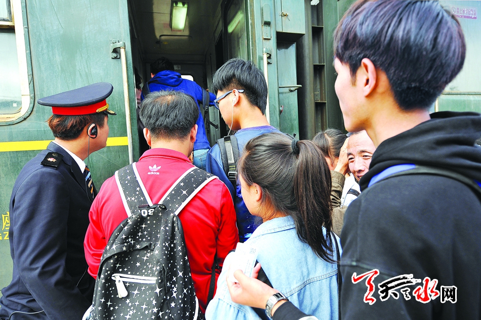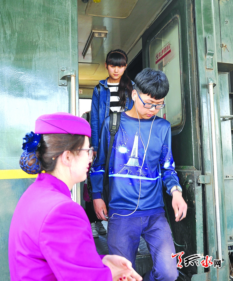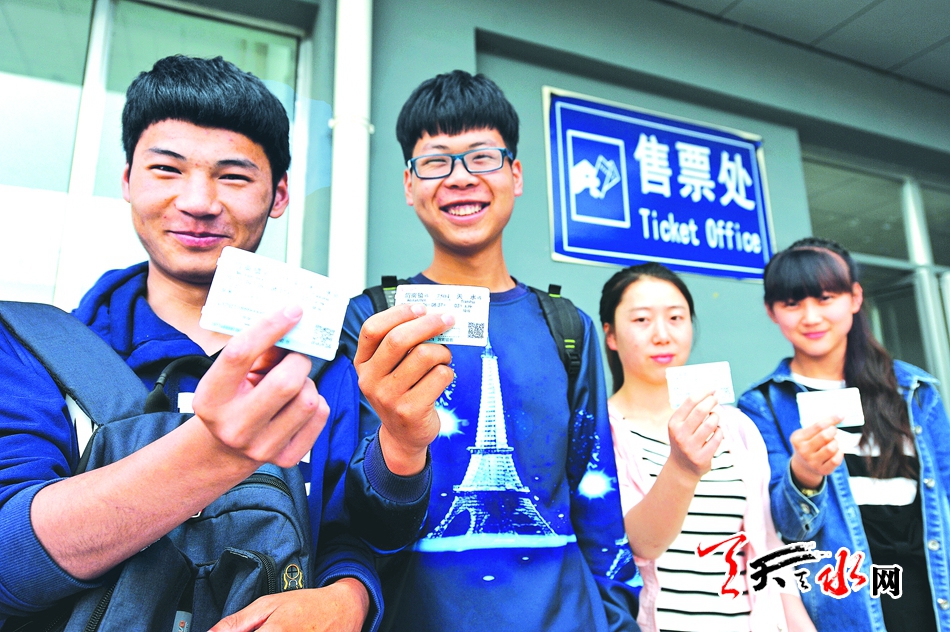 这趟车每天早上8点35分进渭南镇站,张家父女8点不到就在站外,张秀娟等待约好的同学一起进站上车。车站8点开始售票,考生和家长也多了起来,大家在售票厅自觉排队,买票进站。考生赵虎霞的奶奶送孙女到车站,拉着手反复叮嘱:“考学辛苦得很,要吃好睡好,照顾好自己。”赵虎霞展开双臂给奶奶一个大大的拥抱,并凑到奶奶耳边说:“有妈妈陪着呢,您就放心吧。”同是天水市十中高三毕业生的杨兆烨、台嘉浩穿了一样的“吉利”红短袖,招呼赵虎霞和同学们候车。火车快进站时,安检口放行,考生和家长陆续进站。