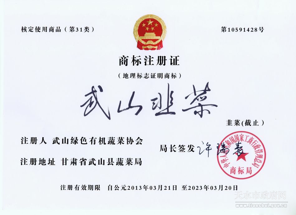 “武山韭菜”、“武山蒜苗”成功注册国家地理标志证明商标,韭菜、莴笋、蒜苗等18类蔬菜27个产品被认证为国家A级绿色食品,“瑞德园”蔬菜商标被评为甘肃省著名商标,培育出了北顺黄瓜、黑池殿西红柿、南河蒜苗、漳河辣椒等一大批享誉盛名的蔬菜品牌。