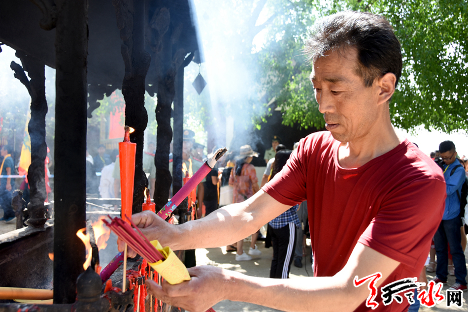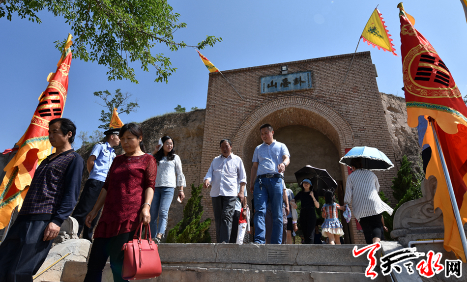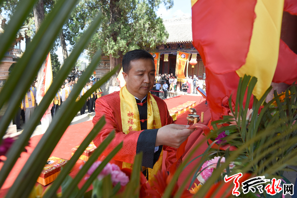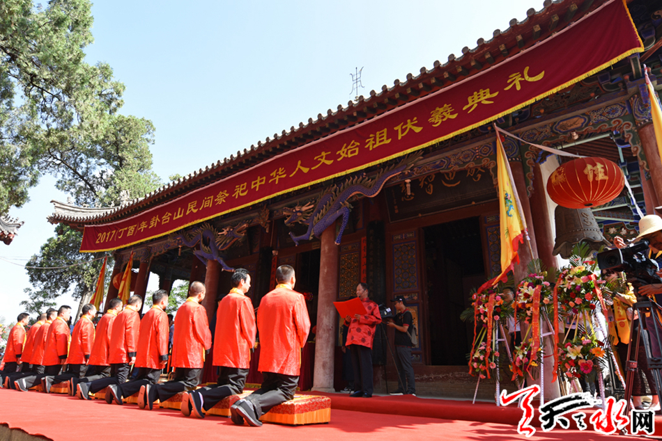 天天天水网讯【全媒体记者 李旺旺】6月21日,碧空万里,惠风和畅。麦积区渭南镇卦台山上古乐悠扬、彩旗猎猎、人潮涌动。2017(丁酉)年民间祭祀中华人文始祖太昊伏羲典礼在这里隆重举行。人们怀着虔诚的心情,在这里祭祀人文始祖,缅怀始祖伏羲,传承华夏文明,表达对伏羲的敬仰。