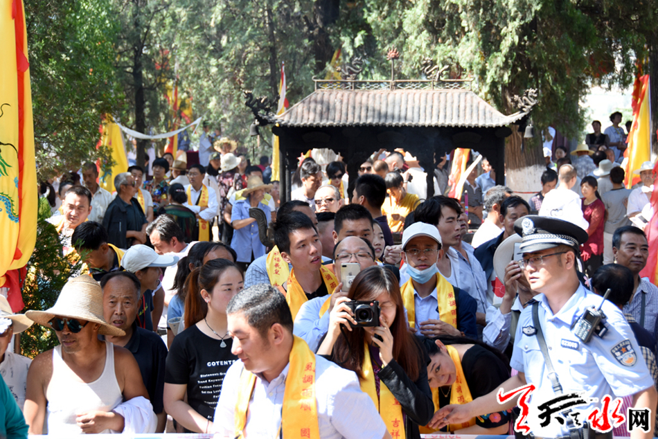 上午9时50分,司仪宣布祭祀活动正式开始。顿时,庙内礼炮齐响、鼓乐共鸣。 在司仪的主持下,献祭品、献箸匙、献壶杯、念祭文、主祭参祭人员敬献花篮、转香等祭祀仪程依次进行。 祭祀仪程结束后,参加祭祀的嘉宾及当地群众络绎走进伏羲大殿,礼敬伏羲、瞻仰圣容。整个祭祀活动庄严恢弘、喜庆热烈。 来自国内外从事伏羲文化研究的专家学者、为卦台山伏羲庙开发建设捐款单位(个人)代表、当地群众等一千余人参加了当天的祭祀活动。