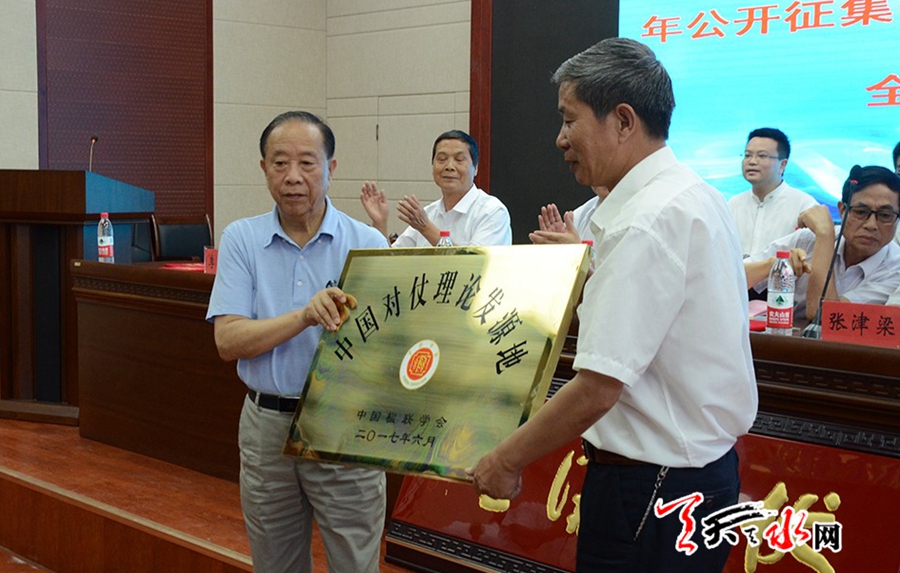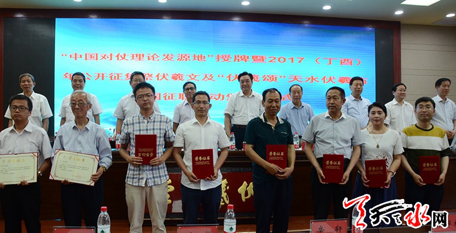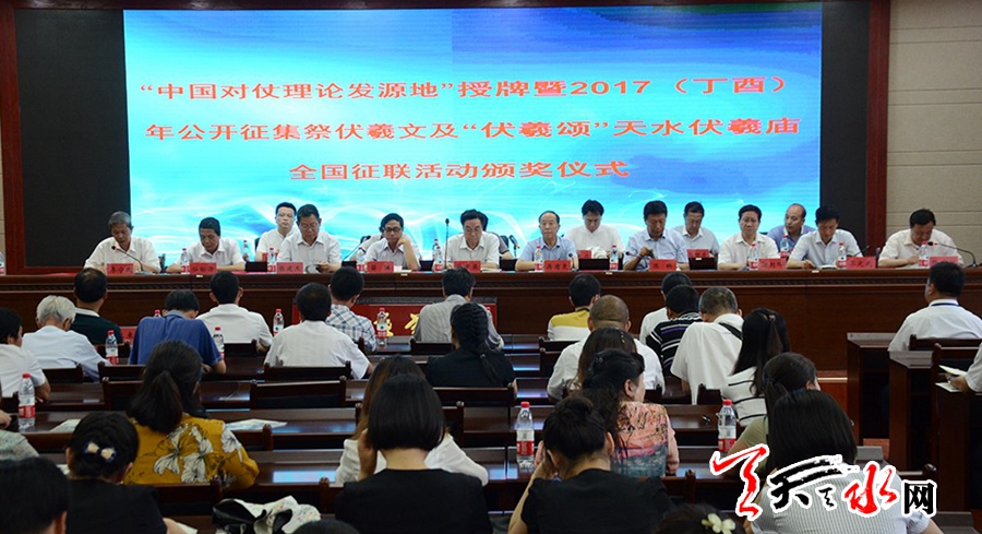 天天天水网讯【记者陈娟】6月22日,“中国对仗理论发源地”授牌暨2017(丁酉)年公开征集祭伏羲文及“伏羲颂”天水伏羲庙全国征联活动颁奖仪式在天水市博物馆举行,天水伏羲庙被中国楹联学会授予“中国对仗理论发源地”。当天,原省政协副主席张津梁、中国楹联学会会长兼秘书长蒋有泉、省楹联学会会长薛渊,市人大常委会副主任蒲朝晖、副市长张建杰、市政协副主席苏定武出席颁奖仪式。