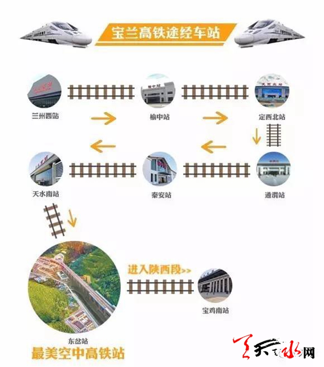 宝鸡至兰州高速铁路自陕西省宝鸡市引出,经甘肃省天水市、秦安县、通渭县、定西市至兰州市。全长401公里,设宝鸡南、天水南、秦安、通渭、定西北、兰州西等8个车站,运营时速250公里。宝兰铁路开通初期,将安排开行动车组列车42对。