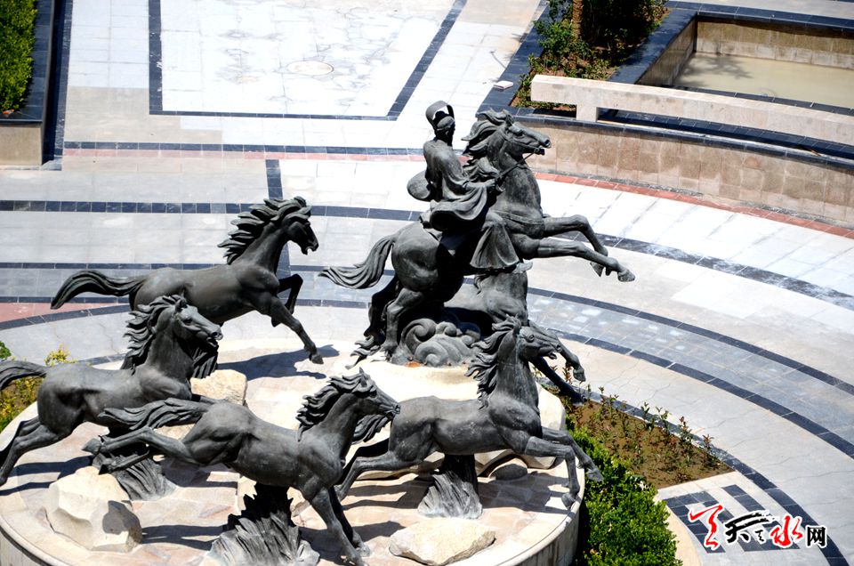 文化主轴,以历史发展的时间顺序为主线,在商业步行街主要入口雕塑“非子牧马、舜赐赢氏、受封建国、征伐西戎、烽火戏诸侯、战国七雄、南门立木、一统天下”,再现一个个鲜明的先秦故事,提高了步行街的文化品位。