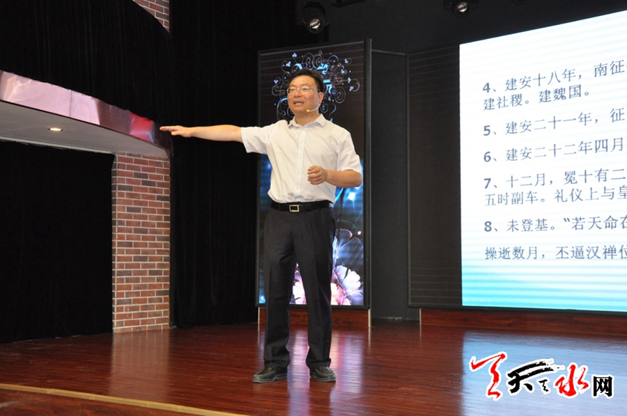 讲座开始后,李博士先回顾了上一讲《三国智慧》中提及的性格决定命运,智慧决定成败,空隙决定机遇,用人决定盛衰,魅力决定实力,胆识决定得失,大势决定兴亡,舆论决定形象的八个决定。接着从著名的“官渡之战”开始,就三国曹魏、蜀刘和孙吴政权的发展、演变以及部分历史人物命运的跌宕进行了详细、精彩的解读,李博士的博学多识让所有听众深深折服,讲解到精彩之处,更是赢得赞许声声。李博士在讲座中引用原著的章节、诗词,甚至是人物对话时信手拈来,脱口而出,对三国历史的发展演变脉络清晰、以历史人物为主题,对三国历史一些节点性、有代表性的历史事件的经典论述也是如数家珍,结合自己对“三国”的学术研究,使整个讲座高潮迭起。近三个小时的讲座,李晓东博士对《三国演义》中的袁绍、董卓、刘备、曹操、孙权、诸葛亮等主要人物的思想发展、管理手段及几个利益集团的博弈、各个阶段对历史进程的影响等进行了详细的剖析,整场讲座李博士联系小说情节和人物命运的变化,结合现实引经据典、风趣幽默地把《三国智慧》潜移默化的植播在每位听众的心中,为天水市的文学作家、文学爱好者及热爱文学的部分市民奉献了一场精彩的文化盛宴,让三国文化在天水的市民心中占据了一定的位置。