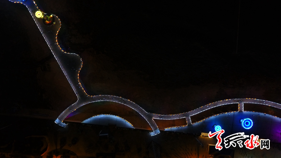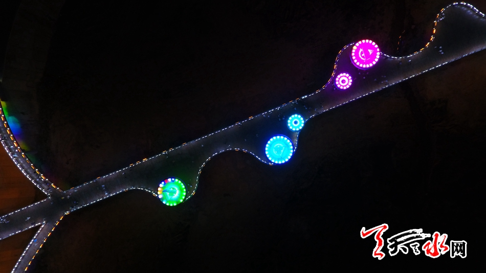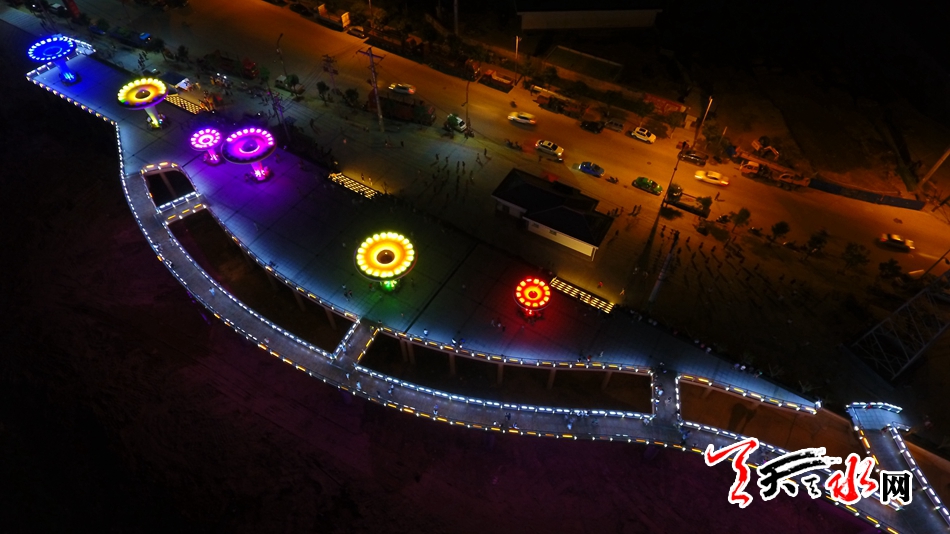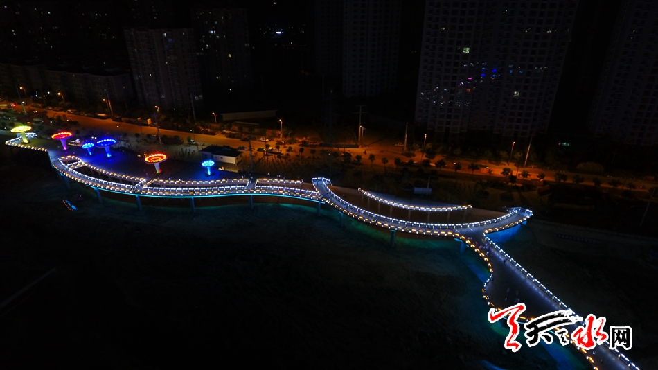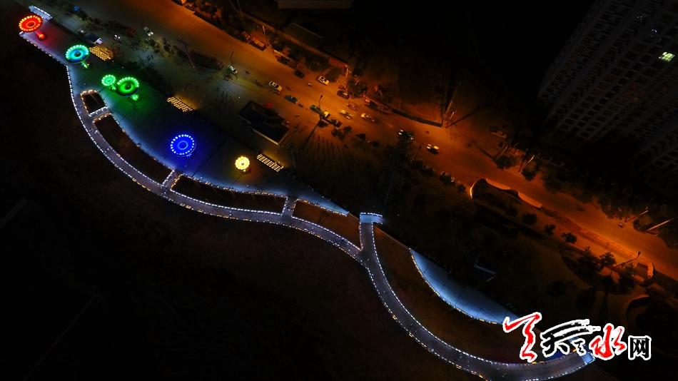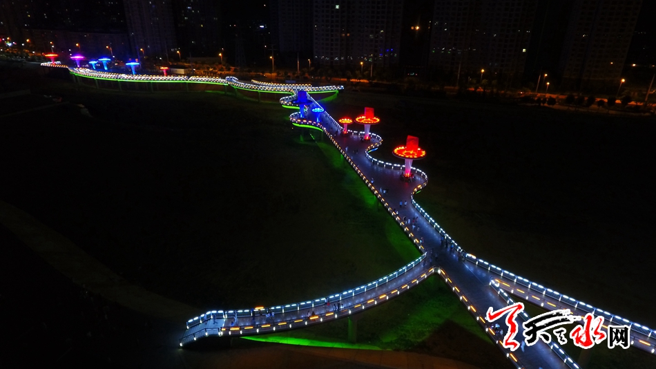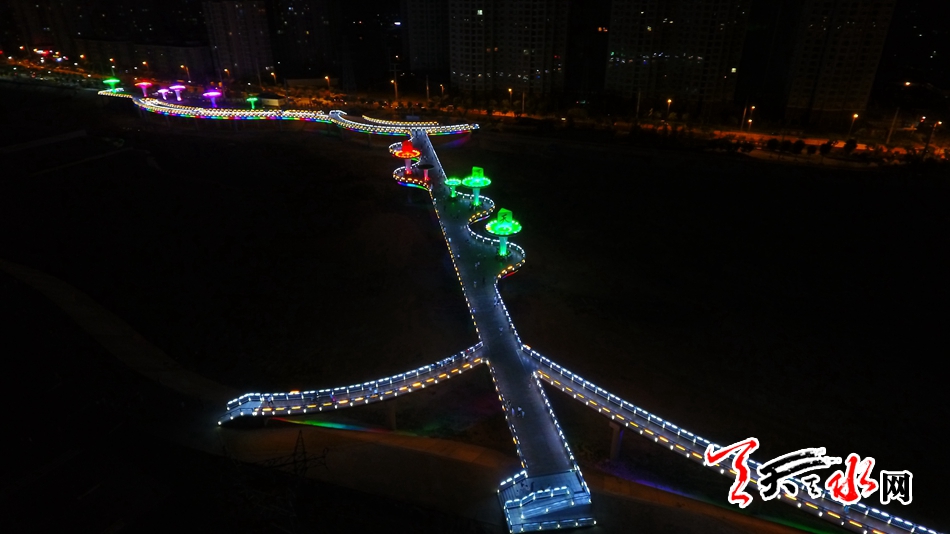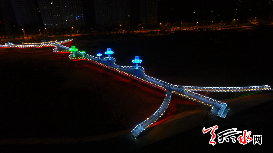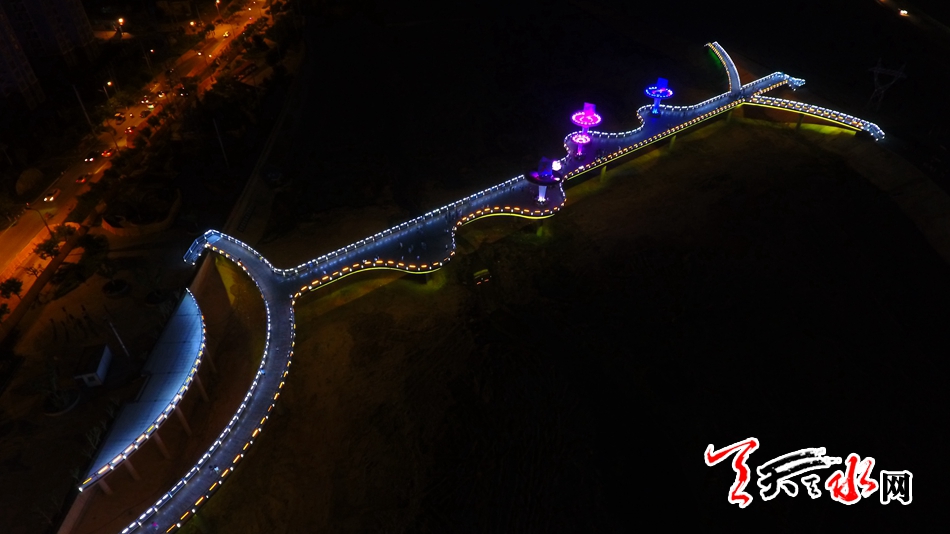 7月13日,天天天水网“航拍天水”采访组对该桥进行了航拍。空中俯瞰整座桥,新颖的设计让整座桥现代感十足,又不失典雅精致,夜幕降临后,桥体通过智能控制系统操控多场景变换的灯光色带,与藉河两岸灯光夜景交相辉映,营造出舒适宜人的光环境,为夜色下的桥体增添了璀璨迷人的水光意境。