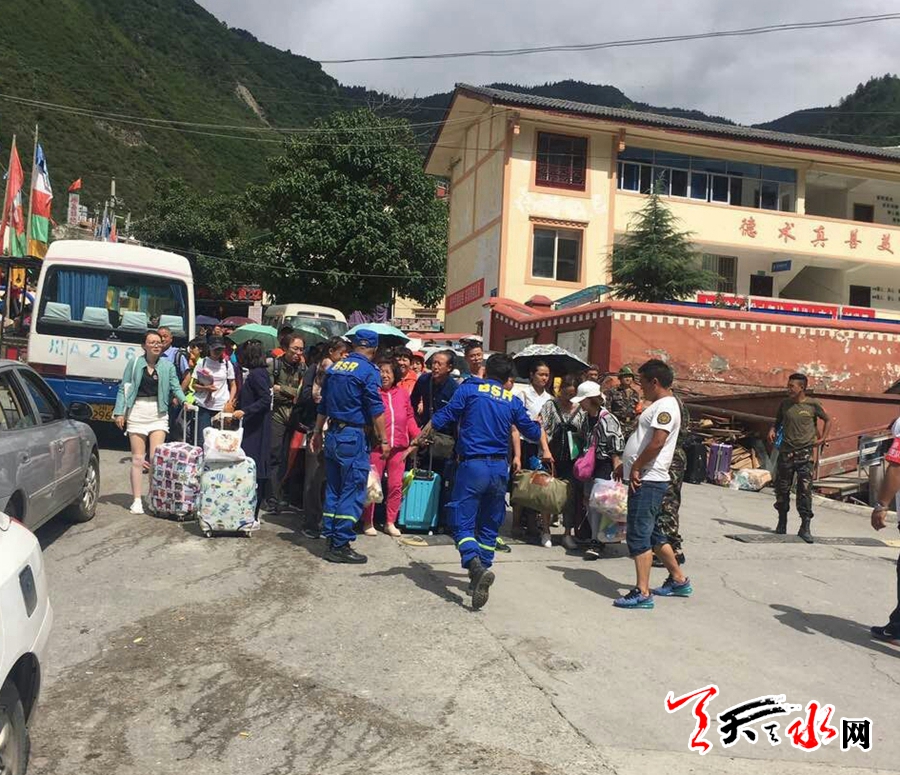 当天15时许,被困在九寨沟风景区的游客在消防官兵的疏导下,有序乘坐甘肃消防天水支队的运兵车离开灾区。