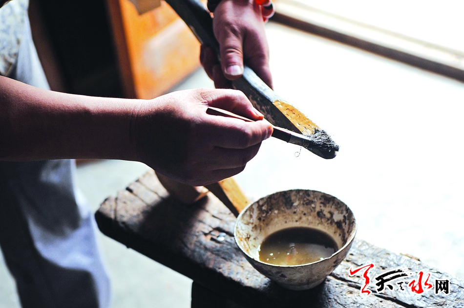 ▲给花几上油包浆。