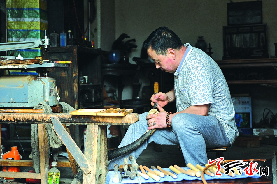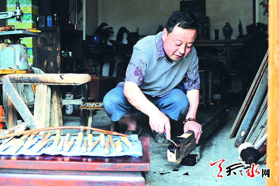 立秋前后的一场雨,让古城天水凉爽而通透。8月8日一早,秦州区玉泉镇瓦窑坡村靠北山的一间民房里,苏卫峰就着刚煮好的罐罐茶吃油饼,仔细端详眼前的一件雕花条桌,发现连接桌面和桌腿的花纹不够圆润,呷了一口酽茶,放下手中的油饼,用细砂纸打磨起来。