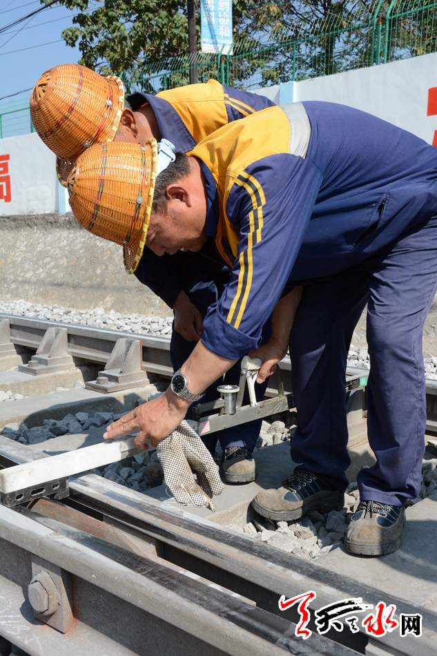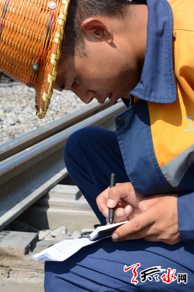 近日,记者来到天水火车站,看到几名线路工头戴安全帽、脚蹬防护鞋,穿着早已湿透的工作服正埋头工作着。每当有列车从他们身边呼啸而过,他们都要排成一排面向列车,观察列车运行的情况。