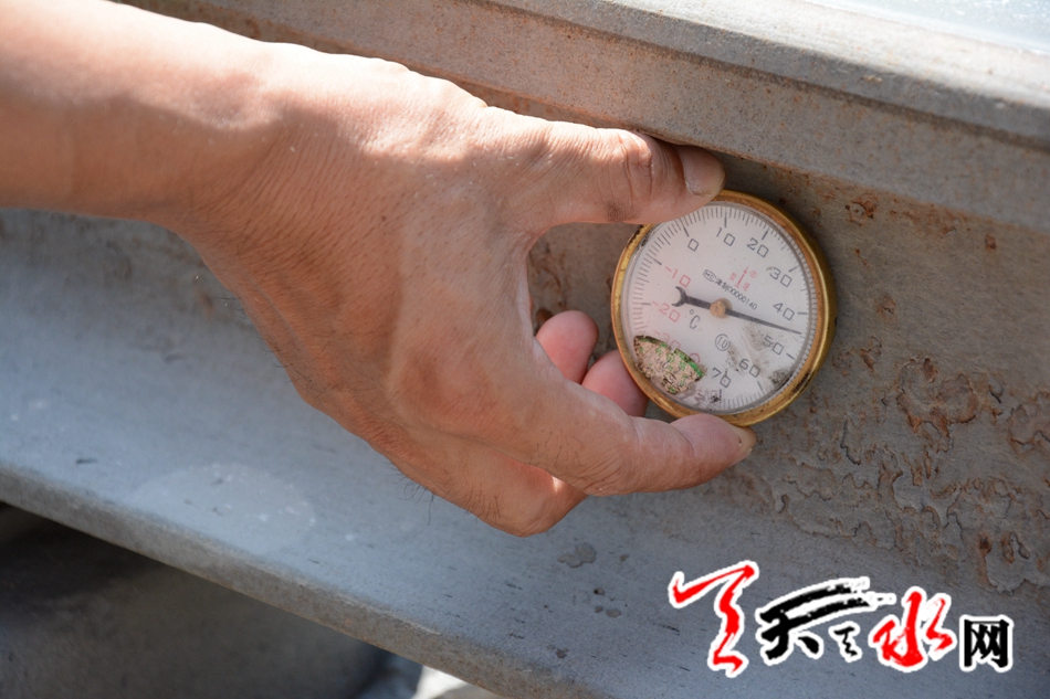 线路工的工作不仅辛苦,工作时间也很特殊,加班加点是常有的事。记者在现场看到,虽然才是早上,铁轨表面的温度已经达到40多度,气温越高,铁轨就越容易变形。所以,越是高温的天气,线路工们越要仔细谨慎。