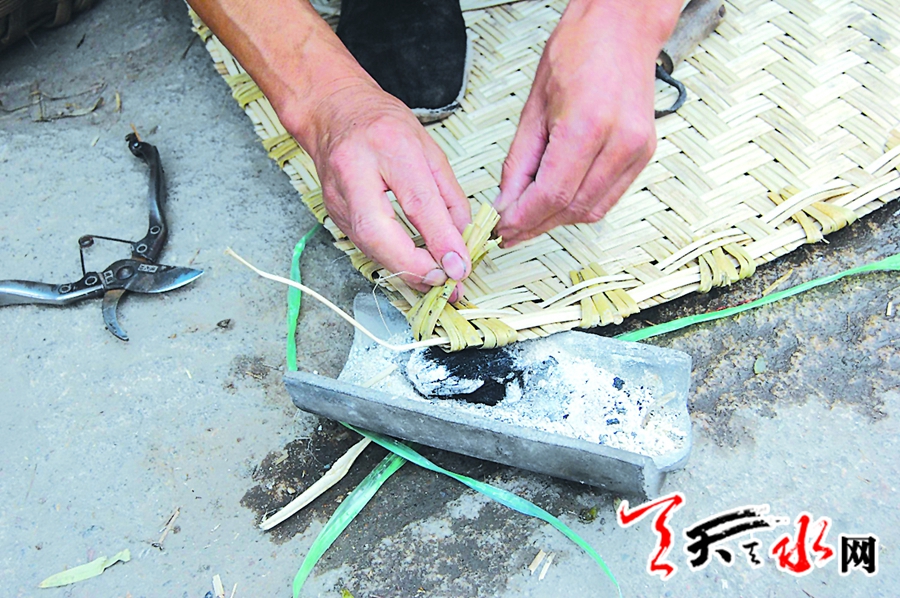 到了给竹席收边的环节,靳长生的妻子拿出一个小搪瓷壶在草席一侧浇上开水,随后靳长生又从后院拈出一瓦楞,上面铺着一层厚厚的灰,灰上放着一块正在燃烧的木炭。只见他在竹席上蹲下身来,慢慢将瓦楞里的木炭垫在竹席收边下方,待篾签烘烤软后便熟练地向内折起,别好,然后再移向下一处。看着他不慌不忙地一点点操作,记者也想试着操作一下,没想到手才靠近木炭,就被炭火的热气给烫了。靳长生告诉记者,竹席收边也算是一道比较复杂的工序,尤其是炭火的火候如果掌握不好,稍不留神要么手被烫起泡,要么篾签被烧焦,别看他现在干这道工序轻车熟路,当初可没少吃苦头。