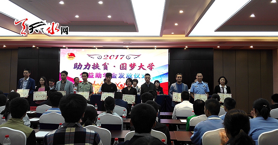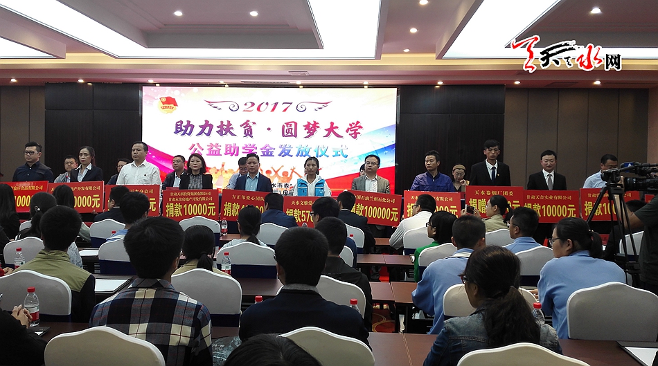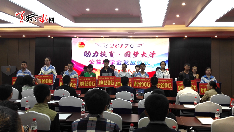 天天天水网讯【记者胡丽霞】8月28日,团市委在天水宾馆举行2017年“助力扶贫·圆梦大学”助学金发放仪式,社会各界爱心企业和爱心人士为全市565名贫困大学生发放助学金109.39万元。市委常委、组织部长王正茂,市人大常委会副主任王晓琴出席助学金发放仪式。