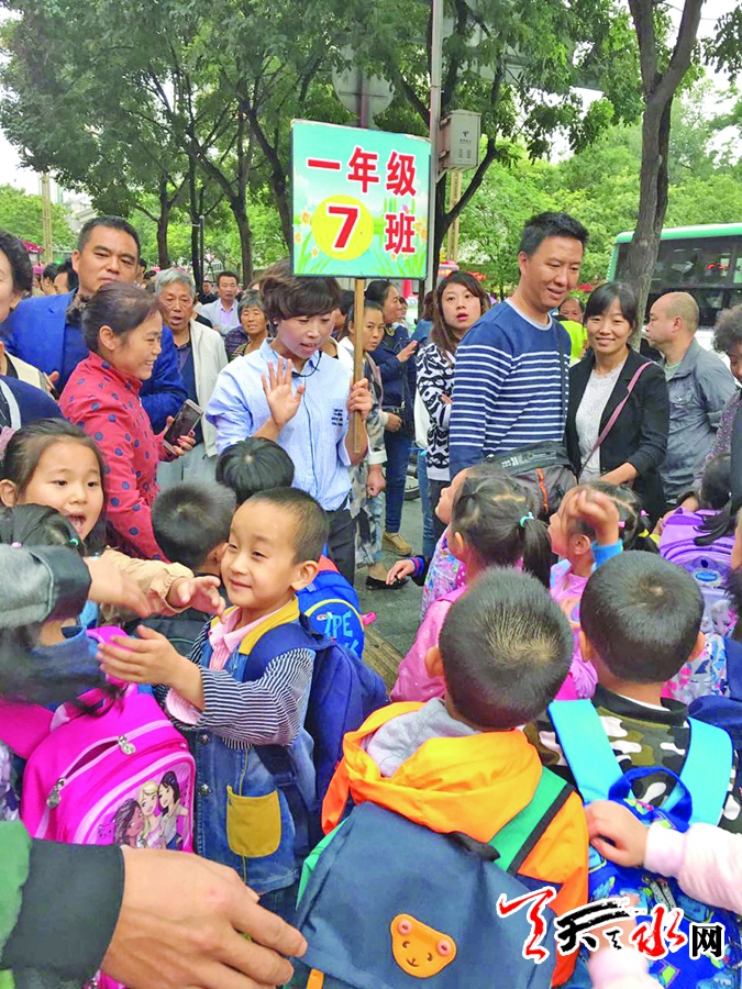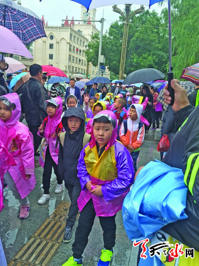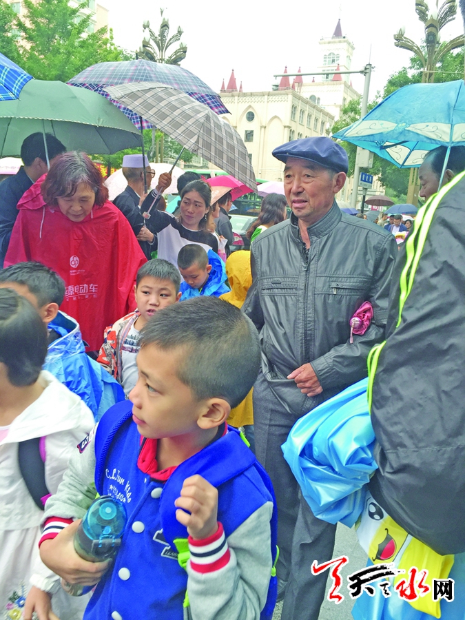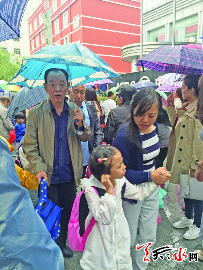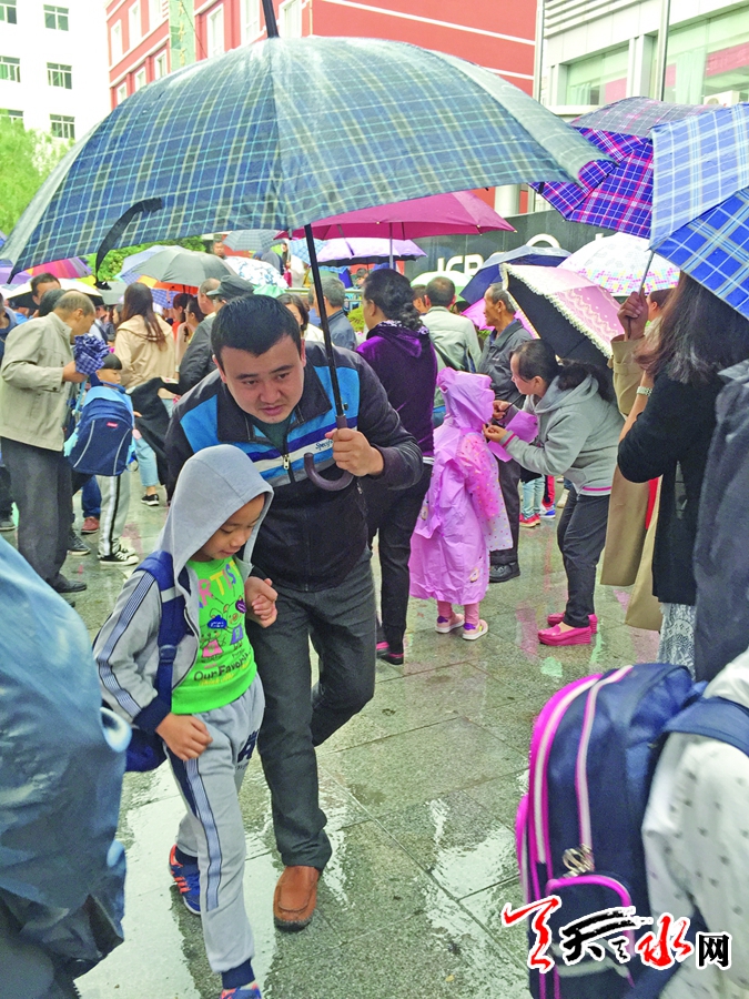 当日中午11时10分,记者在天水建二小学门口看到,尽管下着小雨,学校门前和旁边的街道上,还是挤满了前来接孩子的家长,打着伞、穿着雨衣的家长们将学校门口围得水泄不通,只为早点接到自家孩子。11时20分,一年级的孩子们整整齐齐走出了校门,家长赶紧围了上去接自家的孩子,老师把孩子们一个一个交给家长,挥手和孩子们再见。家长们则一个个给孩子打着伞、穿着雨衣,然后才带着孩子逐渐散去。