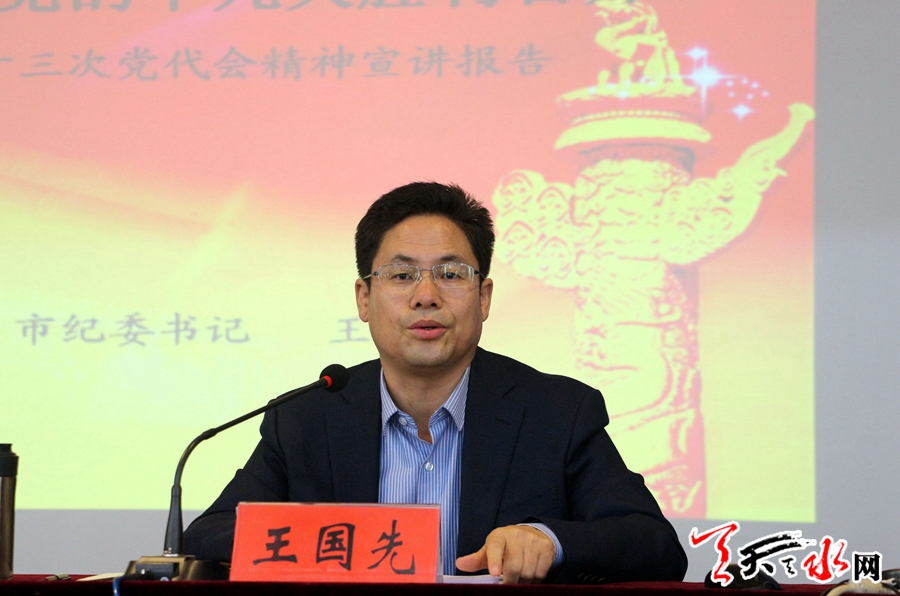 王国先强调,全市各级党组织和广大党员干部要紧密联系天水发展实际,深入学习贯彻习近平总书记系列重要讲话精神和治国理政新理念新思想新战略,全面落实习近平总书记视察甘肃时的重要讲话和“八个着力”重要指示精神,准确把握省第十三次党代会确定的指导思想、奋斗目标、基本要求和着力重点,按照市第七次党代会安排部署,以高度的政治自觉和强烈的责任担当,努力开创各项事业发展新局面。