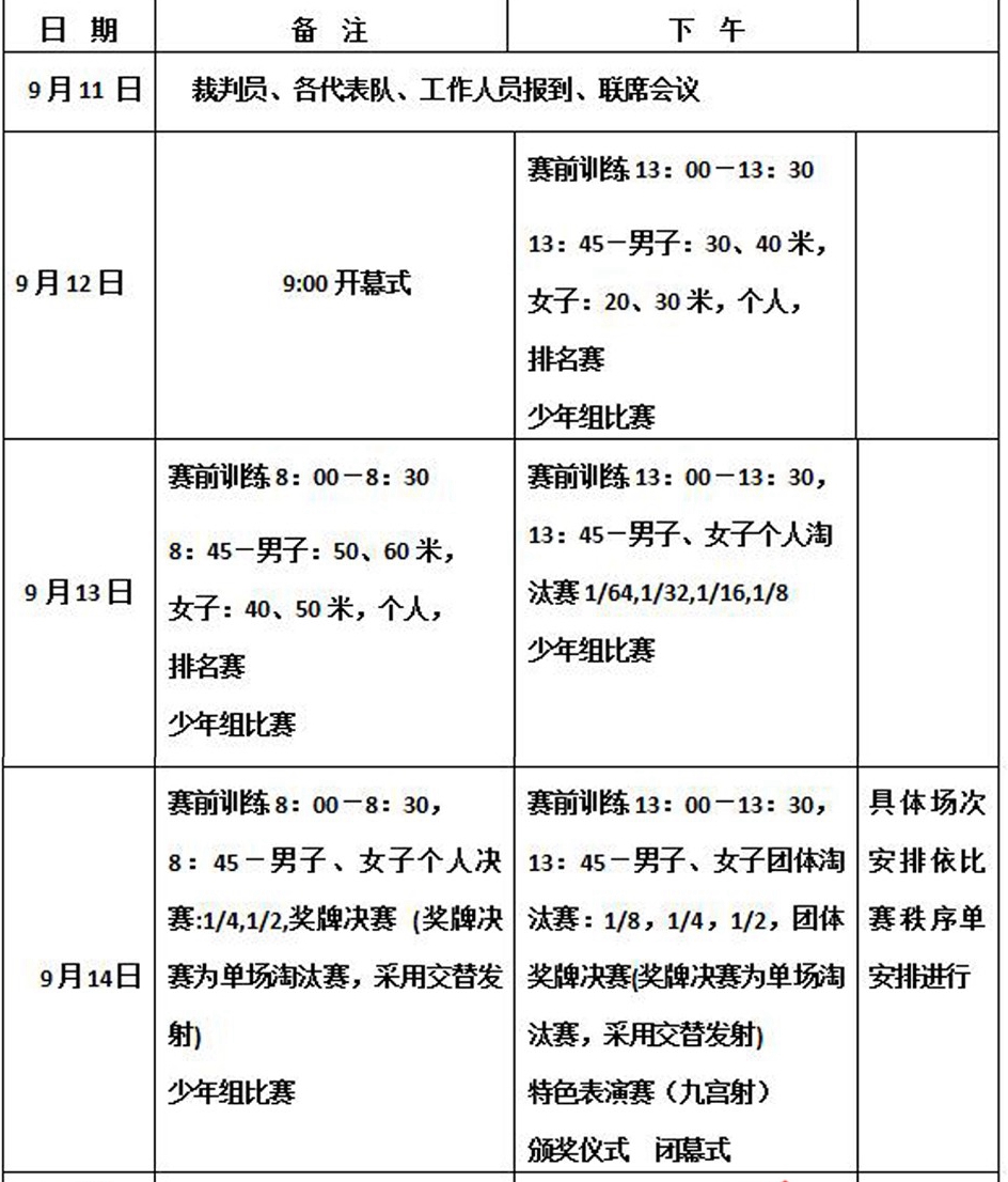 据悉,本次锦标赛由中国射箭协会、甘肃省体育局、天水市人民政府主办,天水市体育局、天水师范学院、天水市秦州区人民政府承办,甘肃省马氏通备武学学会协办。比赛时间为2017年9月12日至15日,比赛地点为天水师范学院。比赛共设四个比赛项目和一个表演项目。