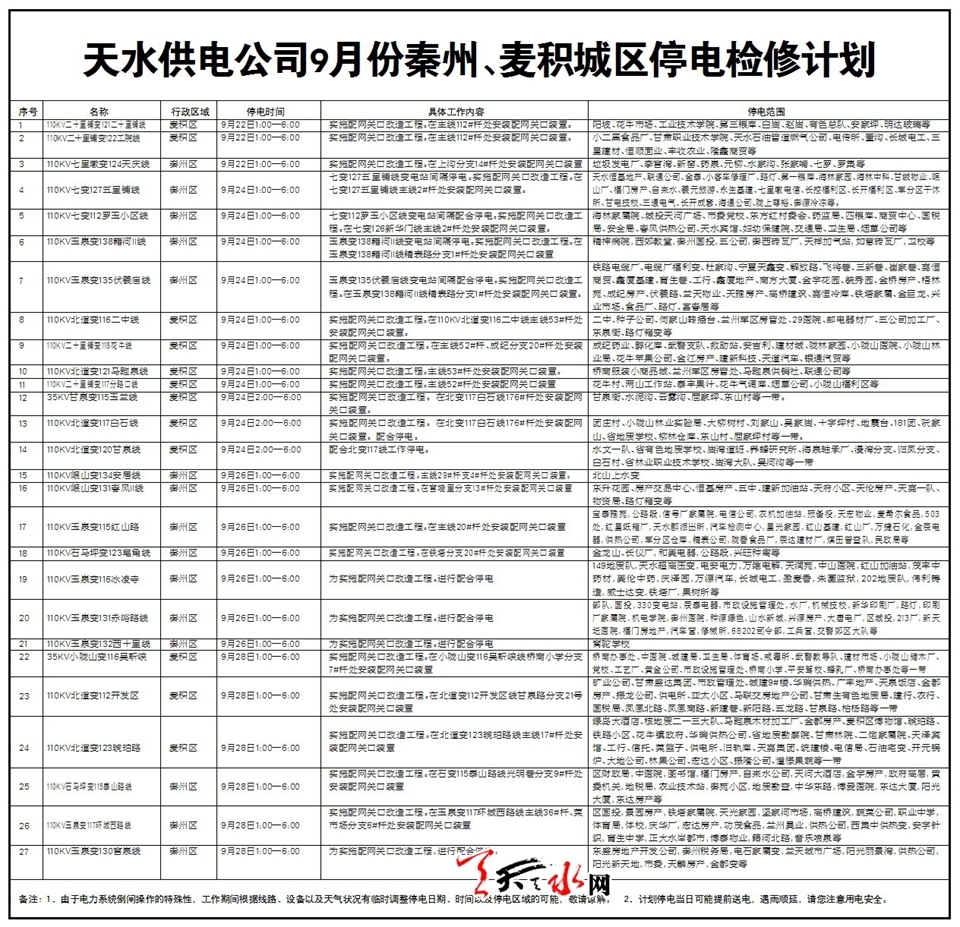 9月份秦州麦积城区这些地方要停电 请市民提前作为准备