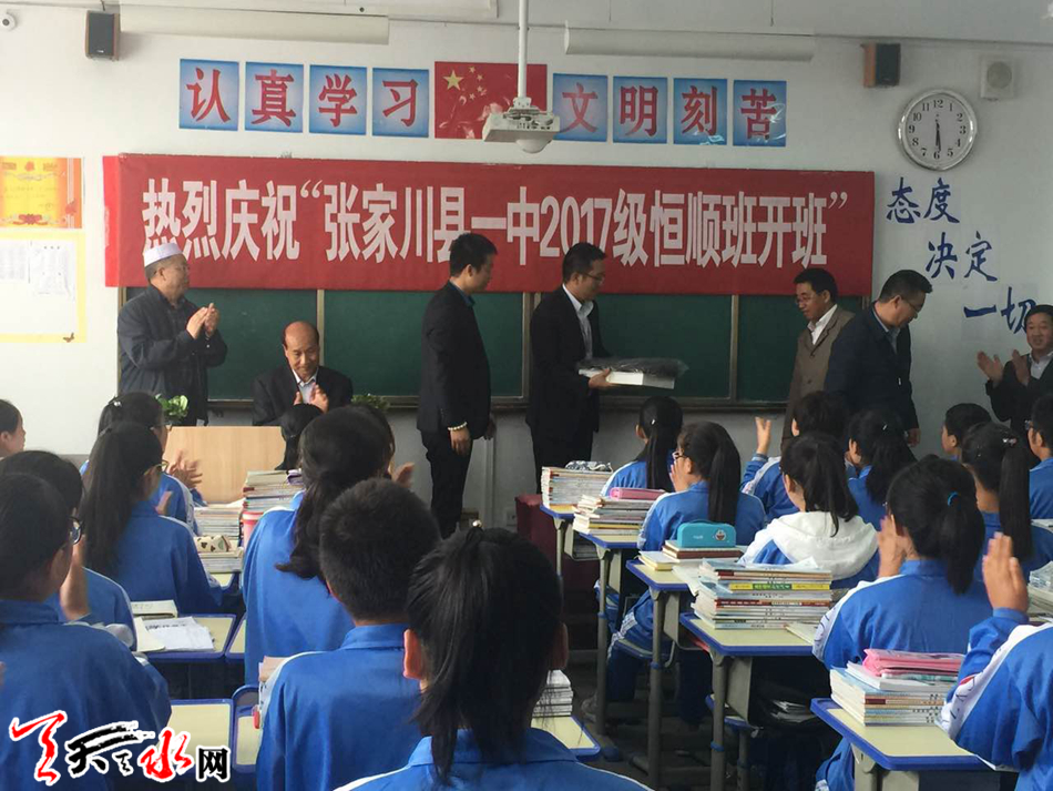 天天天水网讯 9月12日,是天水张家川“恒顺班”开班的日子。恒顺班56名同学怀着无比感恩的心情迎接天水恒顺房地产开发有限公司一行人的到来。开班仪式上,张家川一中校长张双琪致了感谢词,对恒顺地产对张家川学子这份爱心表示感谢。恒顺地产公司代表作了发言,并为恒顺班56名同学每人发放2000元助学金和笔记本电脑一台,恒顺公司还将为同学们购置一批图书,丰富学生的业余文化生活。最后,张家川县教育局局长王小健作了总结发言,感谢恒顺地产马志忠董事长为家乡教育事业做出的贡献,只有秉承慈善之心,企业才能长足发展。