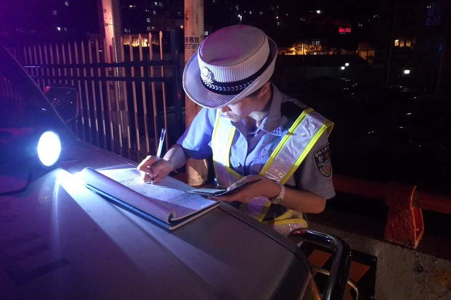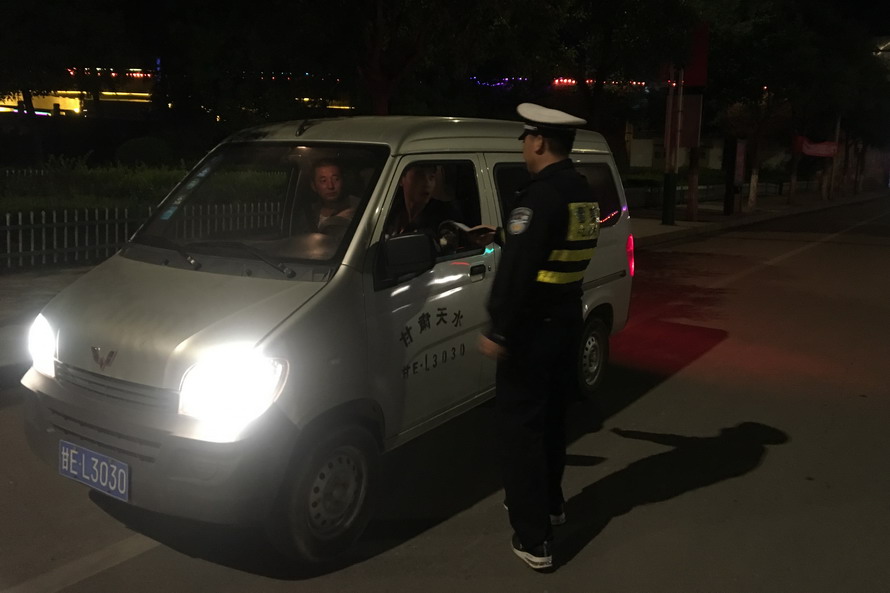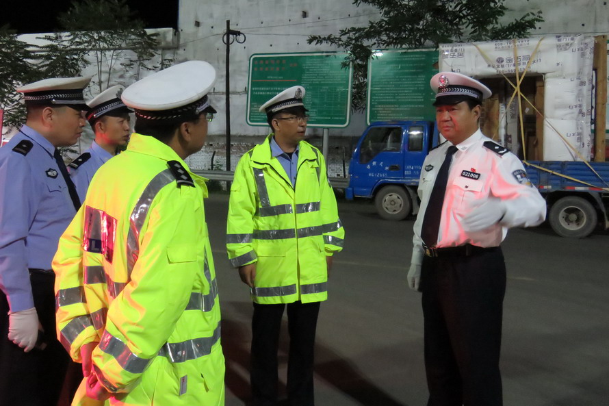 (市公安局党委委员、交警支队支队长柳润泰,交警支队副调研员强亚龙督导检查行动开展情况)