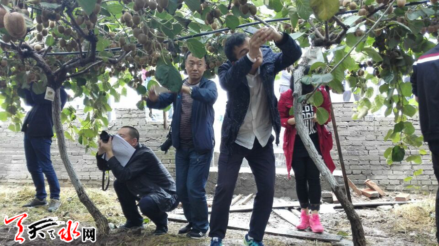 在眉县金渠镇田家寨村的猕猴桃基地,眉县果业技术推广中心主任屈学农告诉采访团记者, 从 1978 年开始,眉县就开始了猕猴桃种质资源调查和人工栽培试验,成为国内最早人工栽种猕猴桃的地区之一,经过几十年的不断发展和建设,先后在全县引进和推广了美味、中华等四大品系,徐香等 20 多个新优品种。截止 2016 年底,全县猕猴桃种植面积达到 30.1 万亩,占陕西省的三分之一,总产量 46 万吨,产值 29 亿元。