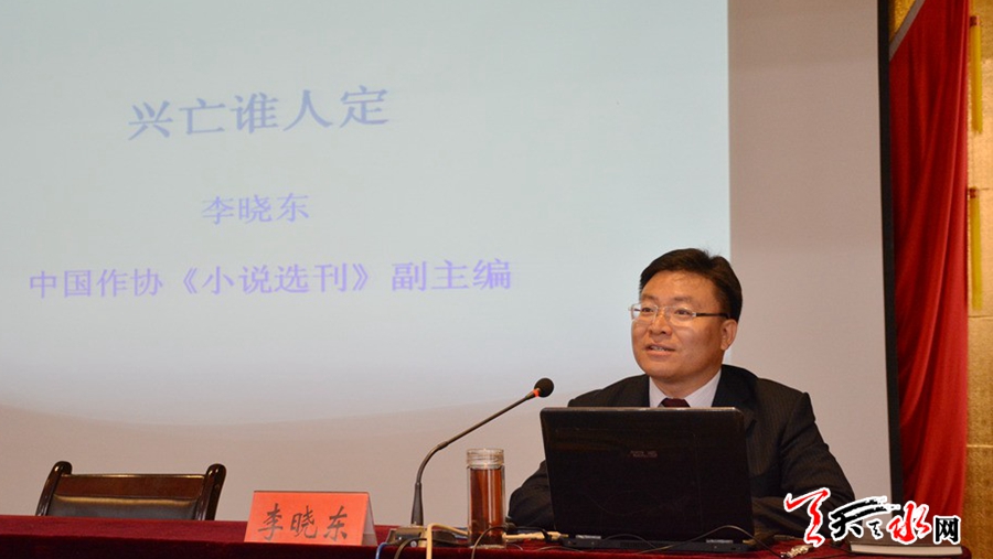 讲座中,李晓东以“兴亡谁人定”为主题,通过详细解读三国演义带来的“性格决定命运、智慧决定成败、空隙决定机遇、天才决定盛衰、魅力决定实力、胆识决定得失、大势决定兴亡、舆论决定形象”等八个启示,引用诗词及古今中外学术界对《三国演义》的经典论述,从演绎与史实的异同、昙花一现的袁绍集团、曹魏帝国的兴亡、坐断东南之孙吴政权、力弱心强的蜀汉和两晋与南北朝等方面,全方位对三国的时代变迁、历史人物和故事情节进行了深入浅出的讲解,并以史为鉴阐明了三国智慧与决策科学的内在联系,赢得了听众的阵阵掌声。同时他还指出,三国时期天水处于蜀魏交锋前沿,诸葛亮六出祁山、马谡痛失街亭、智收姜维、计杀张郃等重大战事都发生在天水,街亭、天水关、木门道、诸葛军垒等三国古战场遗址,展示出三国文化在天水历史上的厚重一页。