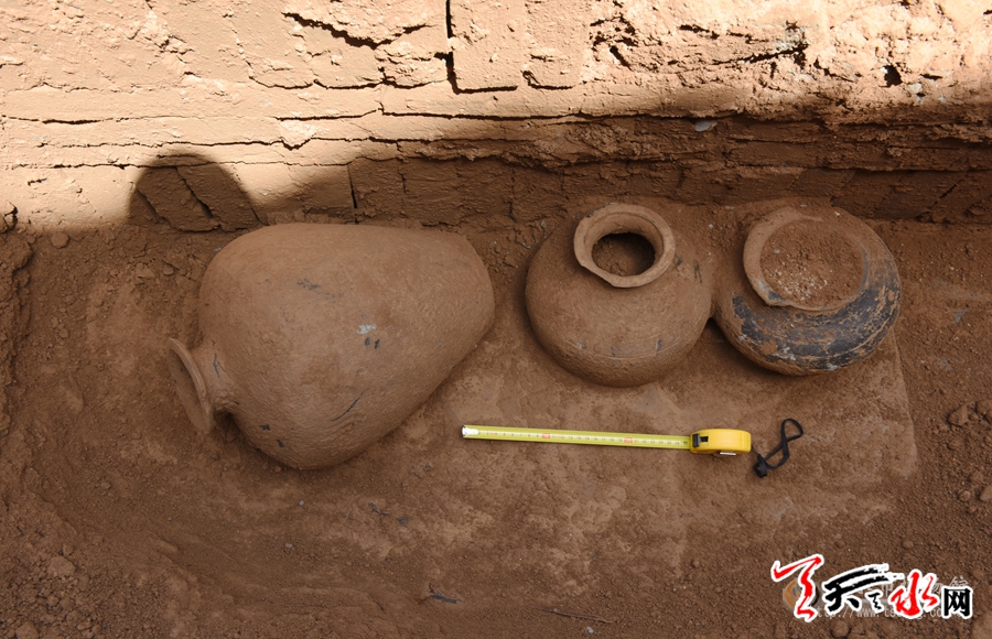 6月20日下午,考古研究所得知秦州区玉泉镇王家磨村西北发现古墓,初步认定是东汉墓葬。从开挖剖面和周围陶片观察,墓葬开口位于近现代扰土层下,打破了史前文化层和生土。散落陶片中包含仰韶文化红陶、齐家文化陶鬲残片和汉代灰陶片等。
