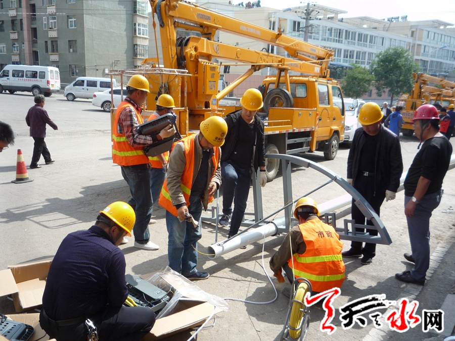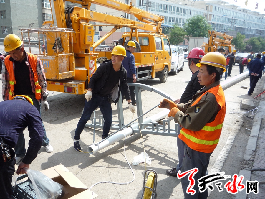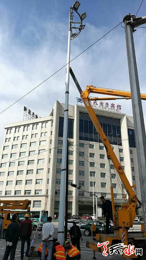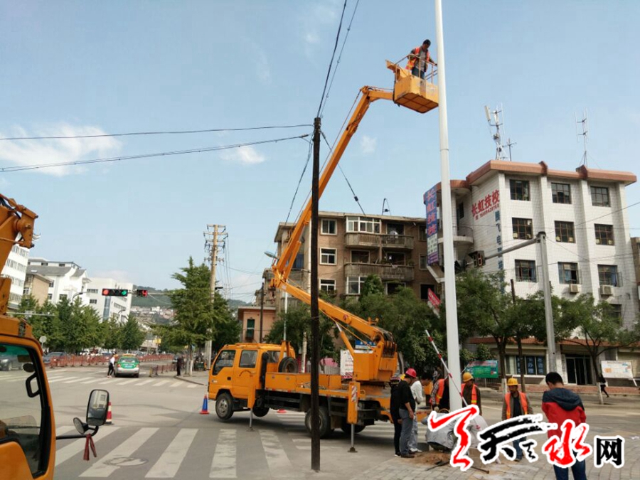 天天天水网讯【记者蔚军平】9月20日,记者在秦州区泰山路看到,秦州区市政设施管理处路灯队的施工人员正在抓紧安装中杆灯,国庆节前夕,师院路、永庆路十字路口等地的城市照明设施将得到完善。
