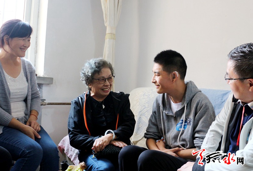 天天天水网讯【记者徐媛】9月24日,中国市长协会顾问、北京爱尔公益基金会创会会长陶斯亮带领爱尔公益基金会工作人员来到麦积区花牛小区看望了市一中听障学生朱庆鹏。