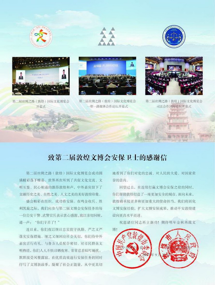 转入敦煌文博会交通安保工作实战阶段后,特勤队采取飞机场、火车站、老收费站3个重点路口设立形象岗、临时岗、固定岗和执勤管辖路段流动巡逻相结合的勤务模式,在当地交通劝导员的大力配合下,充分发扬党员先锋模范带头作用,克服困难,连续作战,规范执法,文明执勤,顺利完成“2017一带一路媒体合作论坛”、“第二届丝绸之路(敦煌)国际文化博览会”以及“丝绸之路(敦煌)司法合作国际论坛”期间二级警卫任务2批次、三级警卫保障任务22批次,日均保障接、送机任务14班次,管控分流货车、农用车、三轮摩托车和电动车等通告管制车辆日均80余台次,查处纠正车辆乱停乱放、果农占道经营、非会议用车占用文博车道等行为曰均近100起,以精细的工作举措、良好的执法形象赢得了上级领导及兄弟单位的肯定和好评。