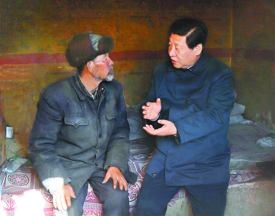 2013年2月3日,习近平总书记来到海拔2400多米、人均纯收入1400多元的定西市渭源县田家河乡元古堆村看望困难群众。图为习近平和八旬老党员马岗亲切交谈,了解生产生活情况。 新华社记者 兰红光
