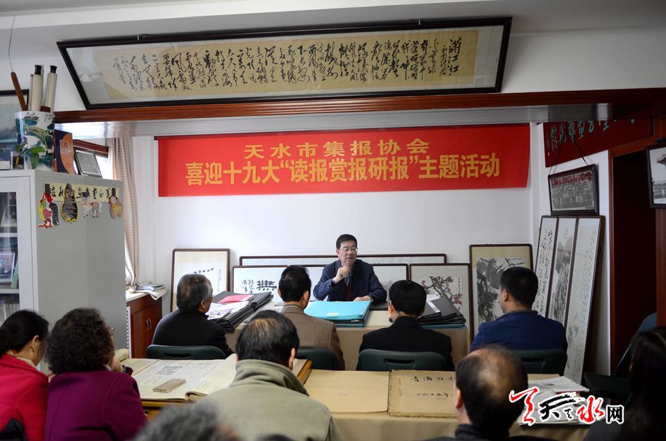 天天天水网讯【记者 张文都】为迎接党的十九大胜利召开,10月15日,天水市集报协会喜迎十九大“读报赏报研报”主题活动在天水养生堂报刊博物馆举行。我市集报协会成员齐聚一堂,一同研讨我国报业发展的峥嵘岁月,追忆一代代伟人在改革道路上的铿锵步履。