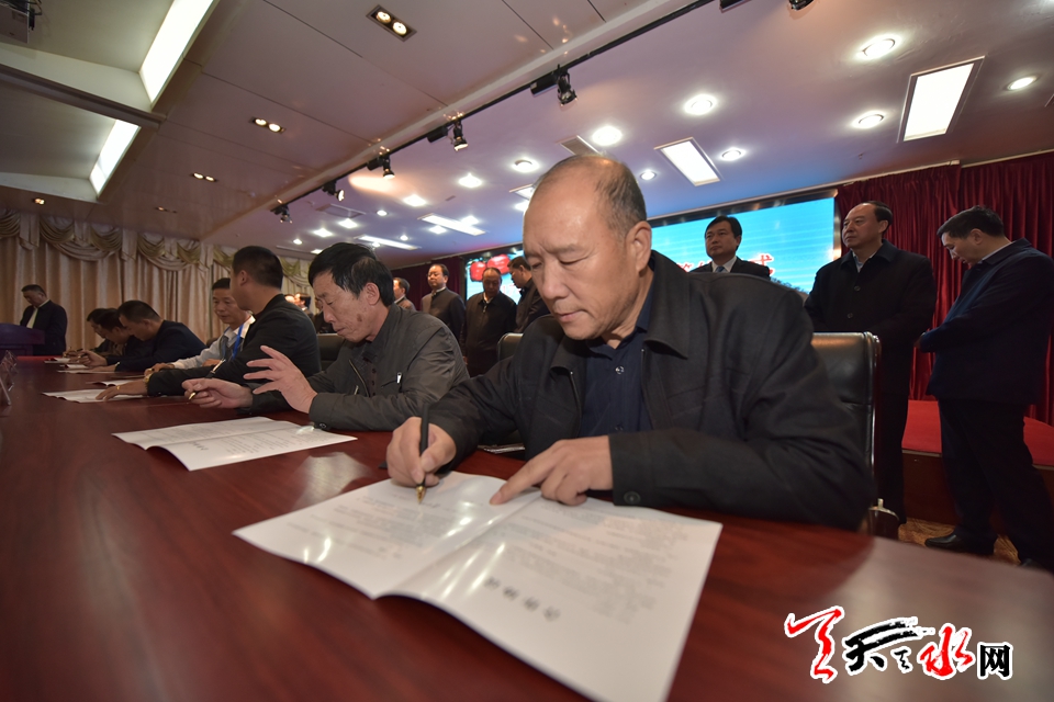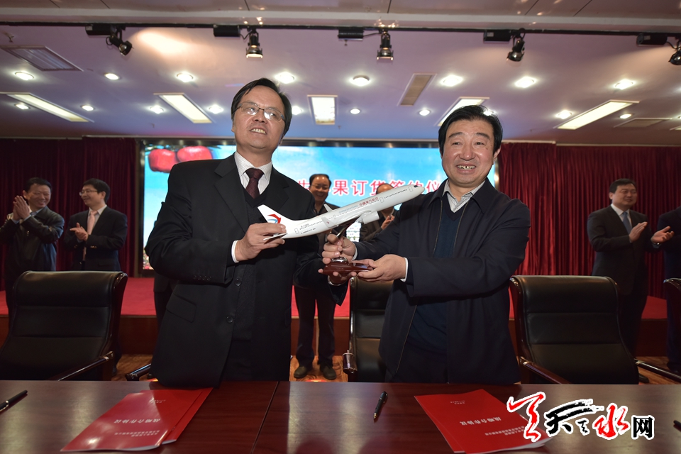 签约仪式上,由天水市人民政府与东方航空食品投资有限公司、中国南航集团地勤有限公司签署战略合作协议。市政府与两家航空公司在天水特色农产品宣传营销推介、电商平台建设、合作交流等方面达成了一系列共识。天水仲林果品有限公司和陕西西安宝联农产品进出口有限公司、天水百盛果品有限公司和山东佳农诚信果业有限公司、天水百富佳果品有限公司和福建久泰农业开发有限公司、清水荣达农业综合开发有限公司和北京新发地市场正华商贸果品有限公司等天水市20家果品营销企业与外地有关企业进行了果品订货签约,现场协议签约果品7.5万吨,购销资金总额3.8亿元。。