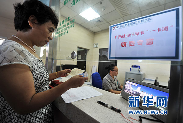 在广西壮族自治区人民医院,从北海到南宁异地就医的郑晓荣持社会保障卡在结算医药费(2015年6月30日摄)。新华社记者 李斌 摄
